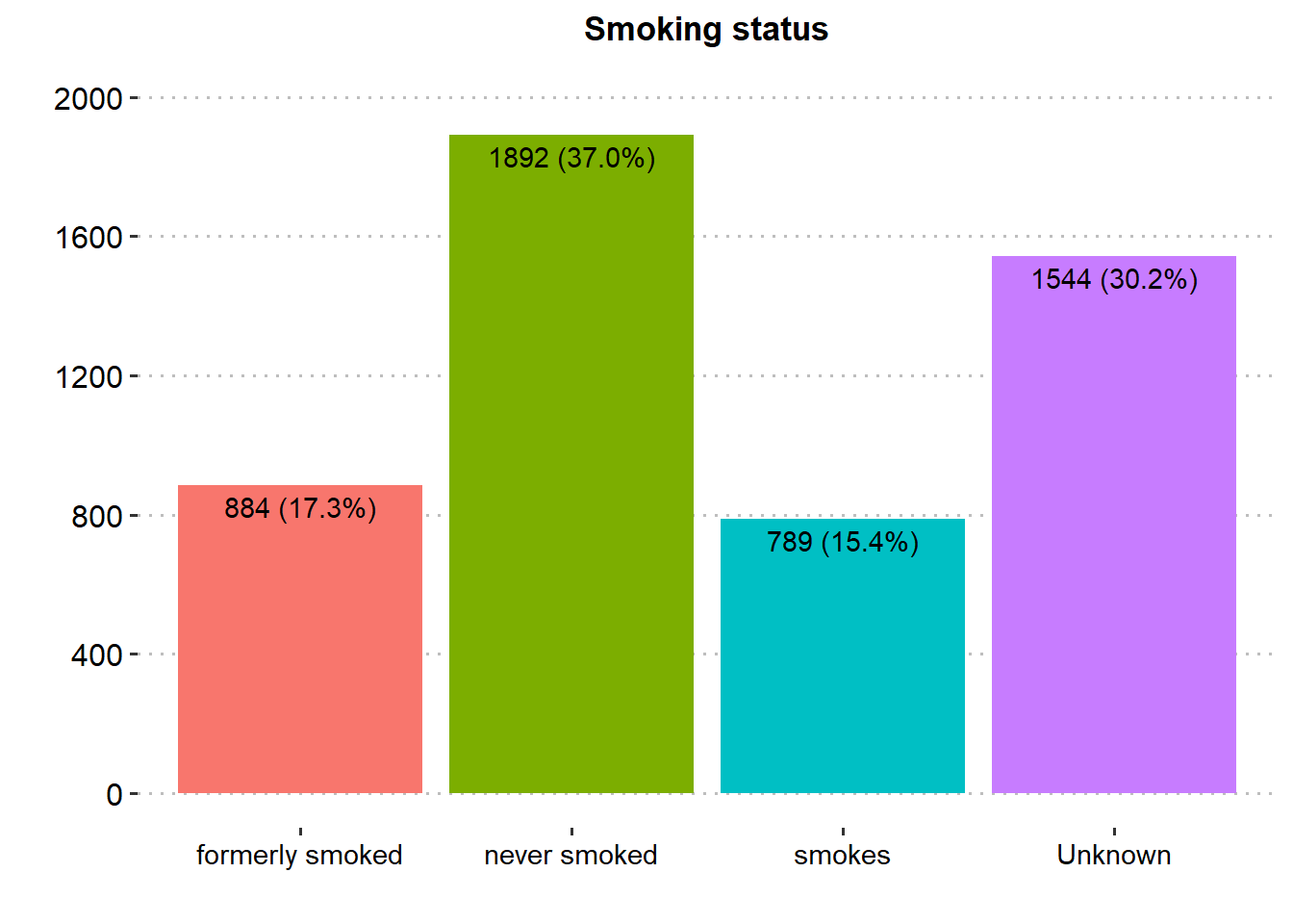 ## $ smoking_status : chr [1:5110] "formerly smoked" "never smoked" "never smoked" "smokes" ...