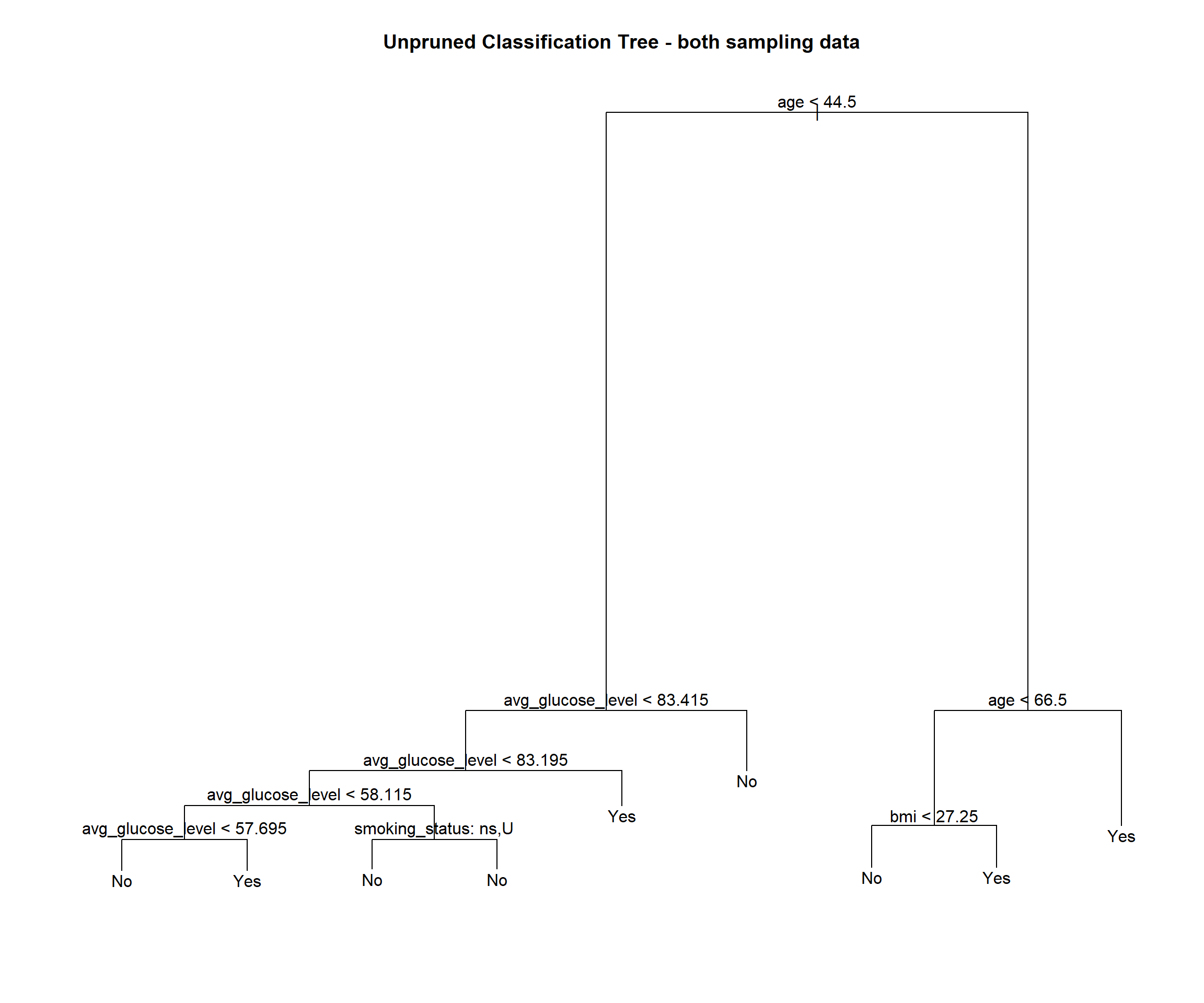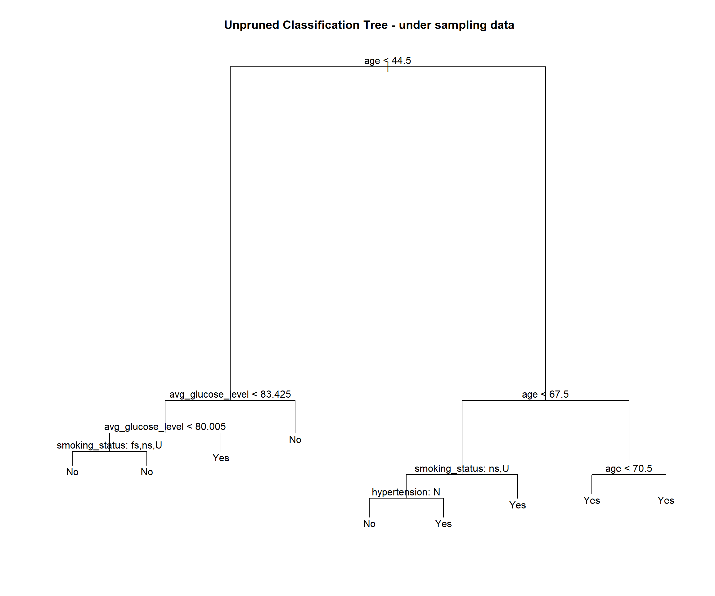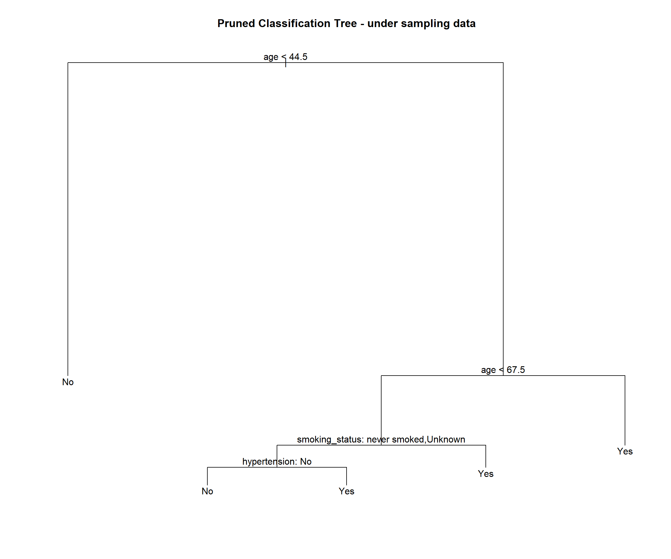 There was an improvement in test set. Pruned under sampled tree model is a better fit than unpruned under sampled tree model. Test Accuracy is higher (70.57% > 66.8%), Test Sensitivity is equal (80.95%) and test Specificity is higher (70.11% > 66.17%)